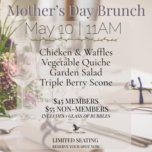 $45 (members) | $55 (non-members) Gather around the table at Duck Pond Cellars for a special 11AM brunch featuring Chicken & Waffles, Vegetable Quiche, Garden Salad, and a Triple Berry Scone, plus a glass of bubbles to celebrate Mom.