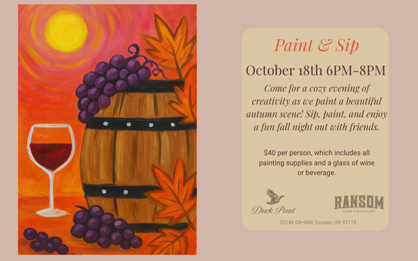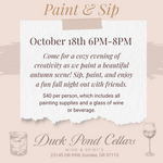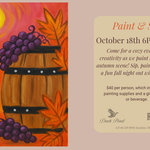 Join us for a cozy evening of creativity as we paint a beautiful autumn scene! Your $40 ticket includes all painting supplies and a glass of wine or beverage. Food will be available for purchase, so come hungry. This is perfect for all skill levels just bring yourself, sip, paint, and enjoy a fun fall night out.